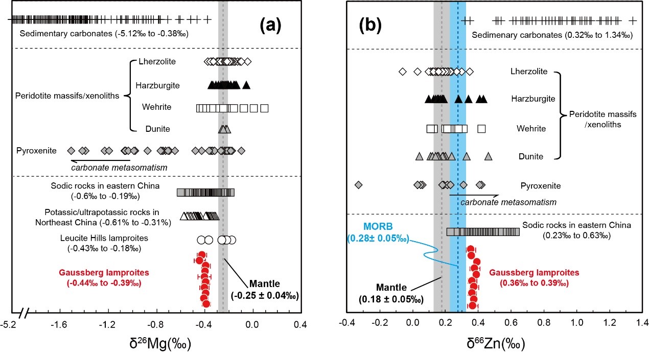 为了阐明克拉通型钾镁煌斑岩与再循环碳酸盐之间的成因联系,我系“岩石学与地幔地球化学学科团队”刘建强博士及其合作者对采自南极洲的Gaussberg钾镁煌斑岩进行了Mg和Zn同位素的联合研究。结果表明这些钾镁煌斑岩具有比地幔更轻的d26Mg(–0.44‰至–0.39‰)和更重的d66Zn(0.36‰至0.39