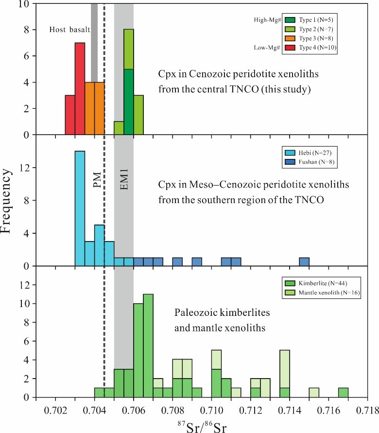 2昔阳-平定橄榄岩捕虏体中单斜辉石原位Sr同位素比值直方图