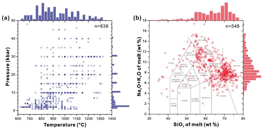 1 (a) 用于机器学习的温度和压力; (b) 含黑云母岩浆体系的熔体成分.