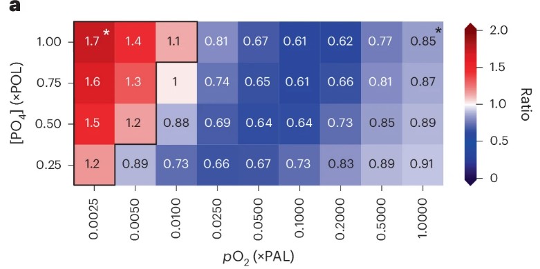 作者进一步定量化揭示了pO2增长与氧气纬度梯度反转的关系。首先,通过不同pO20.0025−1.0 PAL)和海洋营养元素储库([PO4]0.25−1.0 POL)的组合,得到36组模拟结果。其次,根据低纬度(<15°N/S)与中高纬度(15°−50° N/S)上层水体氧气含量的比值以量化纬度梯度:比值<1,低纬度更缺氧,即显生宙梯度;比值>1,低纬度更富氧,即元古宙梯度。结果表明,氧气纬度梯度反转的pO2阈值约介于0.5%−1% PAL(现今大气水平)。