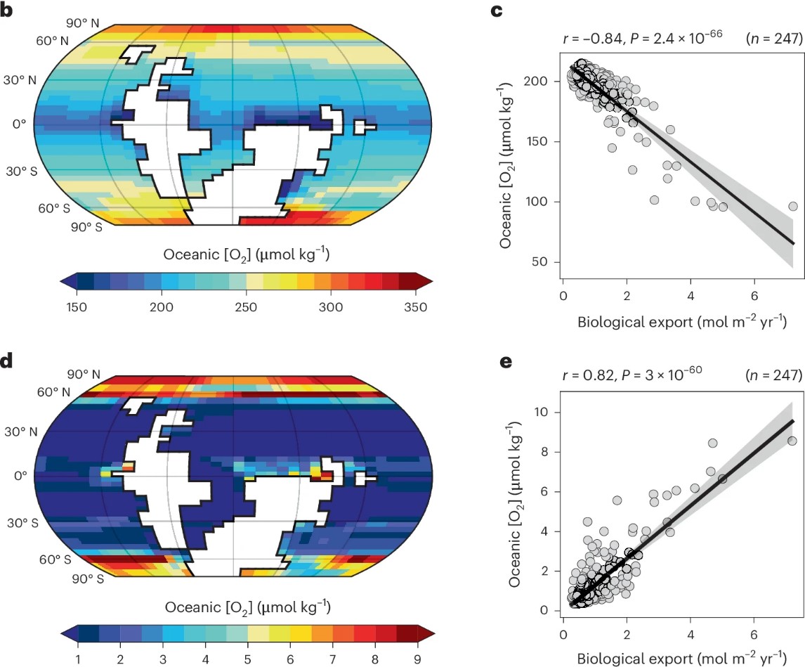 3 地球系统模型中海洋上层水体氧气含量的空间分布及其与生产力的相关关系,b-c)pO2=1 PAL,d-e)pO2=0.0025 PAL