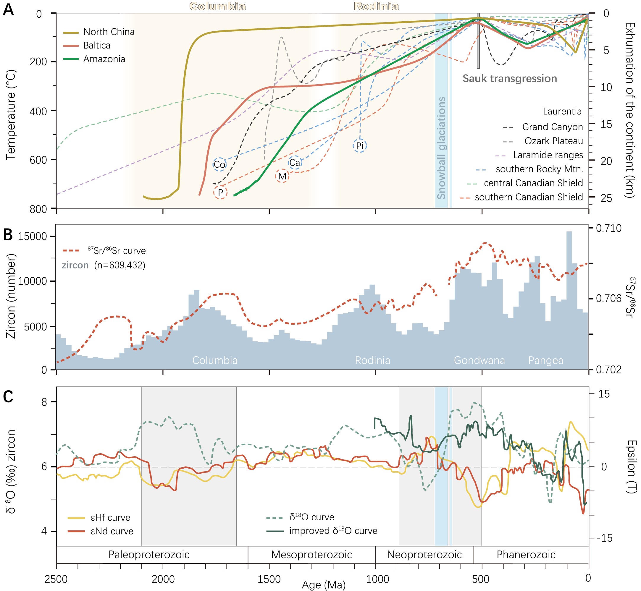 除全球古大陆的多种热年代学数据外,多项同位素指标(87Sr/86Sr, δ18O, εHf, εNd)联合揭示的大陆风化强度的显著升高也同步发生于哥伦比亚超大陆旋回期间。纵观全球,许多古大陆上均发育结晶基底直接被相对平坦的古元古代固结纪(Stratherian)地层所覆盖的现象,表明古大陆的太古宙-古元古代基底均在哥伦比亚超大陆聚合之后就已经被完全剥露至地表,为认识全球性“大不整合”的成因提供了有力的佐证。
