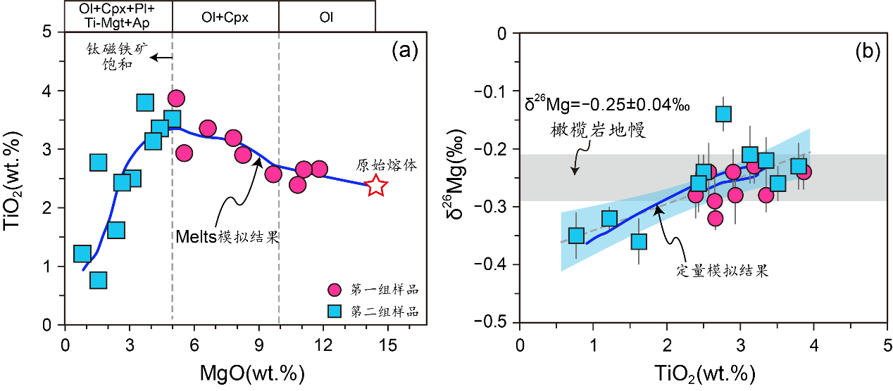对这些样品的斑晶开展的镁同位素分析发现,钛磁铁矿具有比橄榄石、单斜辉石和对应的全岩明显偏重的镁同位素组成(图2)。在玄武质岩浆结晶分异晚期,当这种氧化物大量从岩浆中分离之后,残余熔体的镁同位素组成会明显变轻(图1b)。