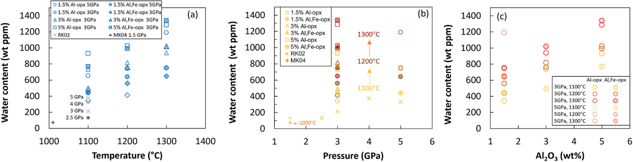1 斜方辉石中氢的溶解度和温度、压力以及Al2O3含量的关系