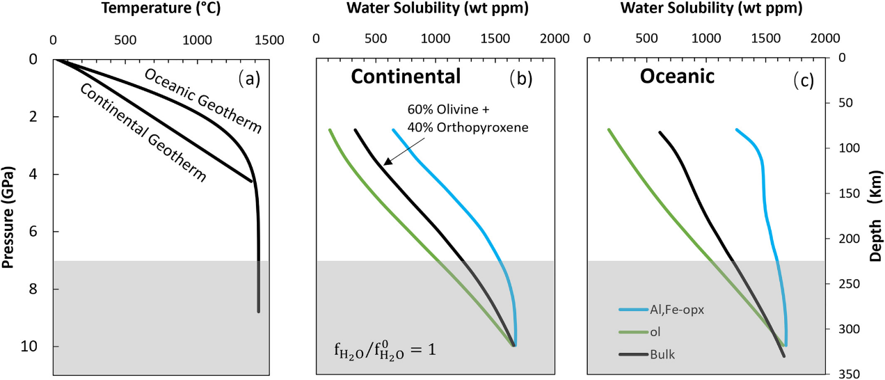 进一步,作者将实验结果推广到开放系统,在相对较低的压力和较低的水逸度(在岩石圈中<50km)较高高,氢主要存在于斜方辉石中,在较高的压力和较高的水逸度(在软流层中)较小,氢大量存在于橄榄石中。
