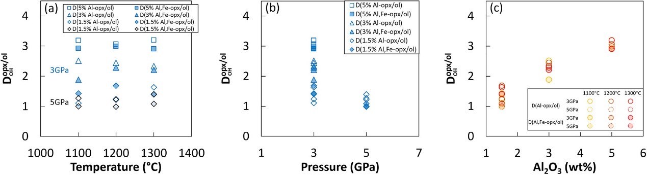在此基础上,作者计算了氢在斜方辉石和橄榄石之间的分配系数,结果表明,该分配系数与温度的相关性很弱,而与压力和水逸度的相关性很强。该结果可能解释了天然样品中氢在斜方辉石和橄榄石分配系数变化较大的原因。