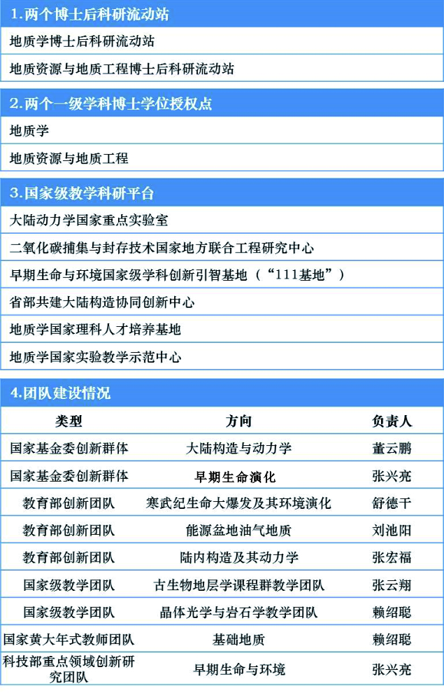6776永利集团理、工并重,特色鲜明。建设有地质学、地质资源与地质工程2个博士后科研流动站,地质学、地质资源与地质工程2个一级学科博士学位授权点以及2个工程硕士授权点;有“地质学”一级学科国家级重点学科,“矿产普查与勘探”二级学科国家重点学科;“地质学”、“资源勘查工程”专业入选国家级“一流本科专业建设点”;拥有国家重点实验室、国家地方联合工程研究中心、国家引智基地、国家理科人才培养基地、国家级实验教学示范中心等;有国家级特色专业2个,主持9门国家级课程建设;先后获得国家自然科学奖一等奖、二等奖,国家科技进步奖二等奖,长江学者成就奖一等奖,成果2次入选“中国十大科技进展”,在Nature、Science发表第一作者论文14篇,获“全国优秀博士后科研流动站”,国家教学成果奖一、二等奖6项,有6篇博士学位论文入选“全国百篇优秀博士学位论文”。