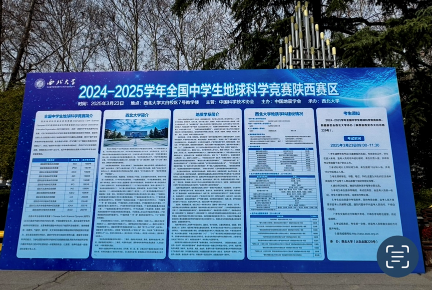 2025年3月23日,由中国地震学会、中国地球物理学会、中国岩石力学与工程学会、中国灾害防御协会主办,yl6776永利集团6776永利集团承办的2024-2025学年全国中学生地球科学奥林匹克竞赛陕西省预赛顺利举行。此次竞赛全省共计2213名中学生参赛,设有yl6776永利集团太白校区、汉中龙岗学校、宝鸡中学、商洛丹凤中学4个考点,西北工业大学附属中学、铁一中、高新一中等39所学校学生参赛。