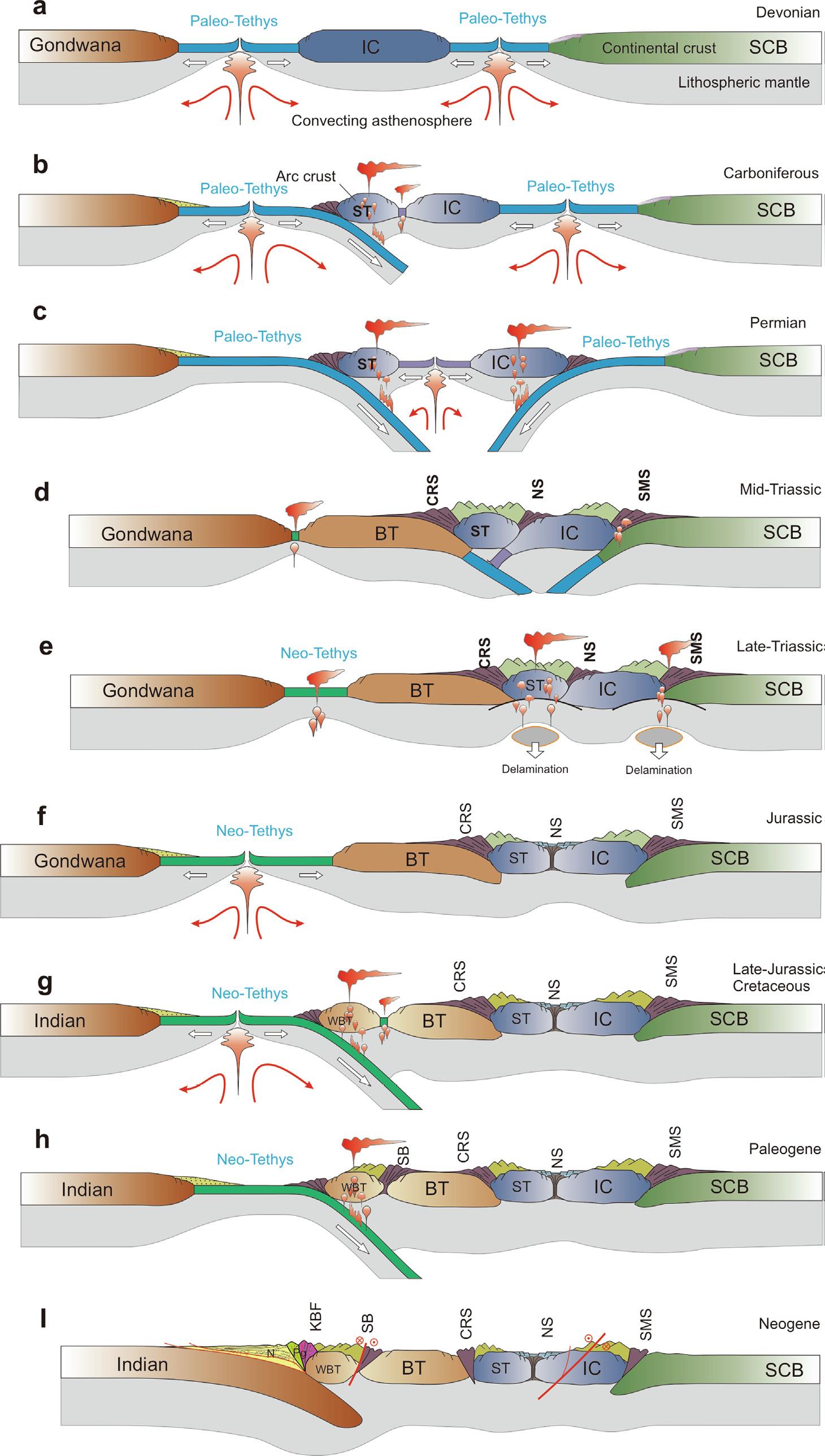 中国大陆贺兰-川滇南北构造带向南连接位于印度板块和中印地块之间的东南亚构造带,综合研究厘定了印支地块、Sukhothai地体、缅甸地体、西缅甸地体,以及其间的多条蛇绿混杂岩带的性质和成因关系,构建了东南亚古特提斯、新特提斯构造演化的新模型(图5)。