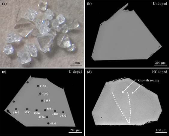 不同元素(如P、Ti、Dy、Th、U和Hf)在进入到锆石晶格中会取代Zr4+和Si4+,影响锆石晶格Si-O四面体的振动(拉曼半高宽),进而会影响锆石辐射损伤年龄的测试精度。自然界中,由于大部分天然锆石均累积了辐射损伤、且包含多种微量元素,难以确定各元素与锆石拉曼半高宽(ν3)的定量关系。为了探讨化学组分对锆石辐射损伤测年精度的影响,采用氧化钼-钼酸锂熔体法(氧化锆(ZrO2)和硅酸锂(Li2SiO3)为原料、氧化钼(MoO3)和钼酸锂(Li2MoO4)为熔剂),在马弗炉高温条件下(950–