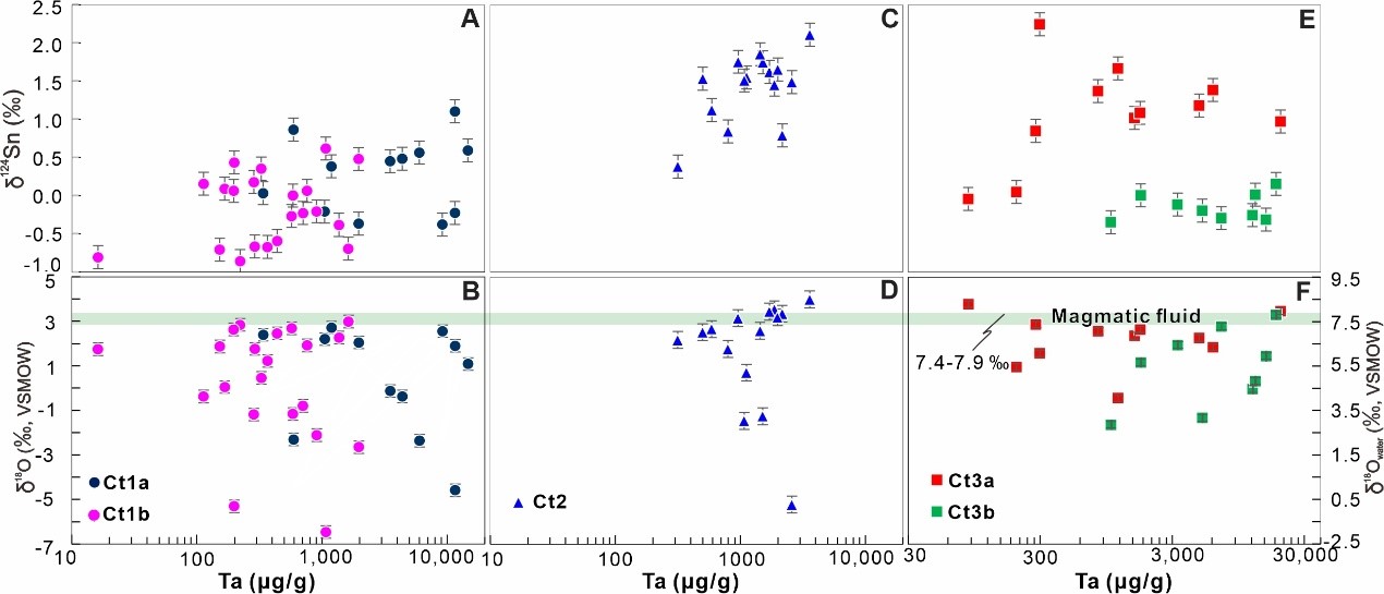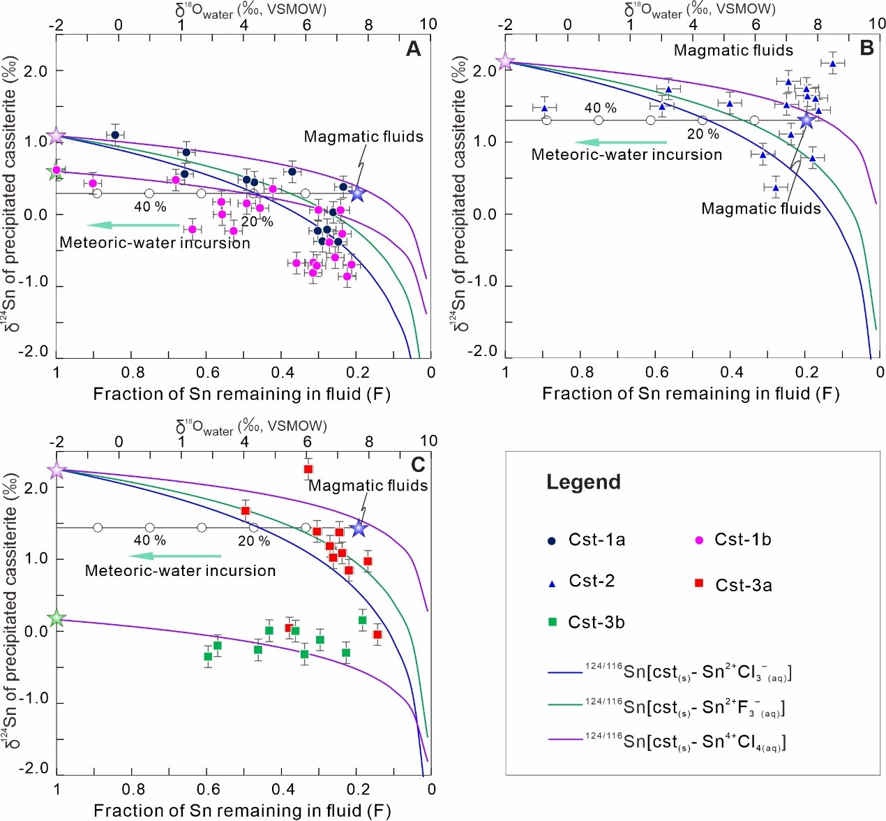 4. 锡石从含不同锡络合物的流体中沉淀时,锡同位素(δ124Sn)演化的瑞利分馏模型,以及不同锡石的δ124Sn与对应的平衡流体的δ18O的关系。Cst-1a、Cst-2和Cst-3a中的δ124Sn与δ18Owater呈负相关,表明每组流体中锡石形成都是由于低δ18O值的大气水的加入