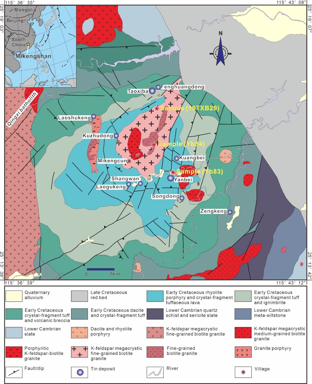 针对这一科学问题,yl6776永利集团6776永利集团刘鹏教授与包志安高级工程师、袁洪林教授合作,在国内率先开发了锡石高精度原位锡同位素分析方法(Zhang et al., 2023),并在毛景文院士指导下,联合国外多个锡矿研究团队开展了系统研究。该研究基于前期在我国华南密坑山锡矿区(图1)复式岩体中发现的不同类型锡石,开展了锡石微观特征、微量元素、氧同位素和锡同位素研究,取得了以下重要认识: