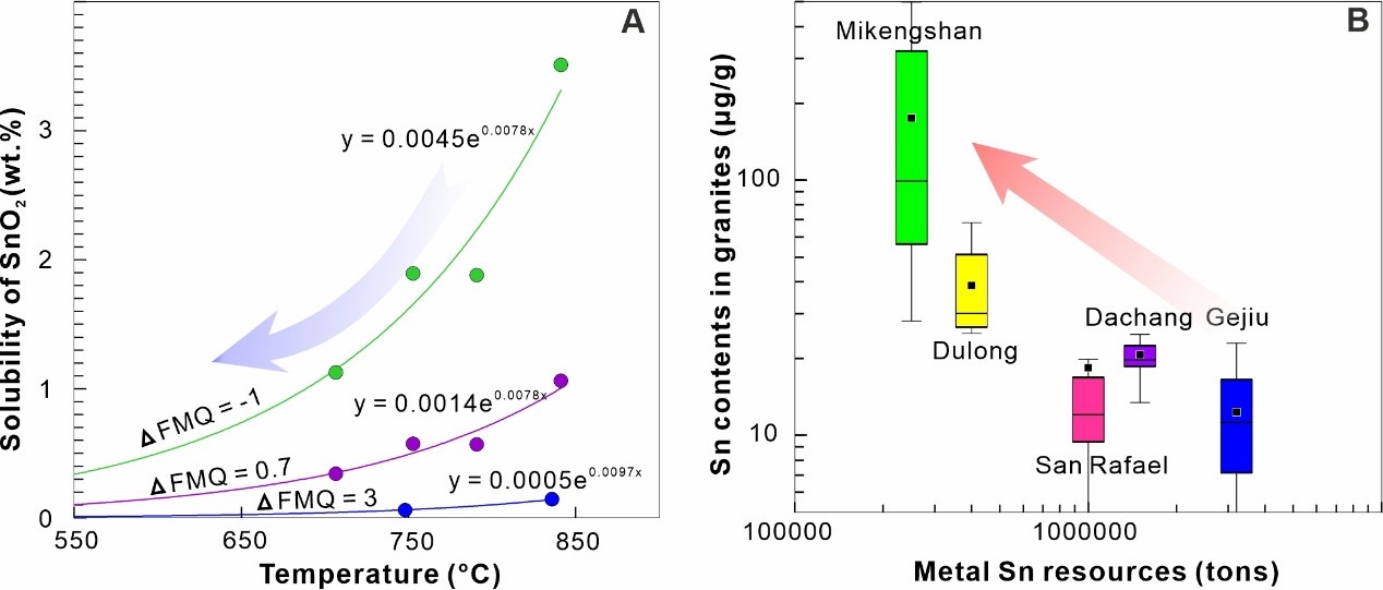 5.(A)不同氧逸度下SnO2溶解度与温度的关系;(B)不同规模锡矿锡资源量与成矿有关花岗岩锡含量的关系